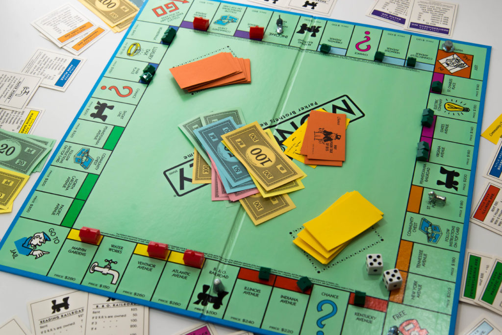 Living at the time of the Great Depression, Charles Darrow was jobless. Sitting around the family table at night with lots of time on his hands, he came up with an idea for a new family game. Cutting out a large cardboard square, he lined the perimeter with names of streets that were connected to Atlantic City’s Boardwalk, added some railroads, dice, buttons, and some hand-carved houses and hotels…along with the illusive bank that never ran out….the game of Monopoly was born.