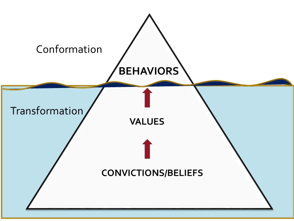 We are told not to be conformed to the world, but neither should we be simply conformed to Christ in external behavior only. Our transformation must go below the water line of behavior to touch our heart and soul.